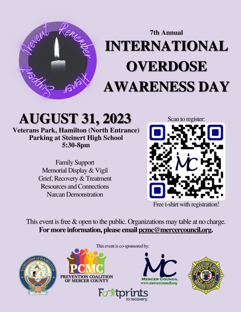 Mercer County’s Overdose Awareness Day event is hosted annually by Mercer Council & the Prevention Coalition of Mercer County. This year we will partner with Footprints to Recovery, the Mercer County Prosecutor’s Office, and Hamilton Township to host this community-wide event.